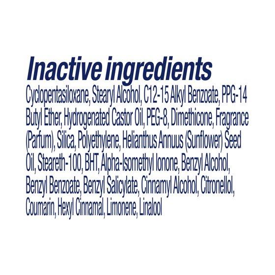 Active Ingredients: Aluminum Zirconium Tetrachlorohydrex GLY (15.2%), Antiperspirant. Inactive Ingredients: Cyclopentasiloxane, Stearyl Alcohol, C12-15 Alkyl Benzoate, PPG-14 Butyl Ether, Hydrogenated Castor Oil, PEG-8, Dimethicone, Fragrance (Parfum), Silica, Polyethylene, Helianthus Annuus, (Sunflower) Seed Oil, Steareth-100, BHT, Alpha-Isomethyl Ionone, Benzyl Alcohol, Benzyl Benzoate, Benzyl Salicylate, Cinnamyl Alcohol, Citronellol, Coumarin, Hexyl Cinnamal, Limonene, Linalool.