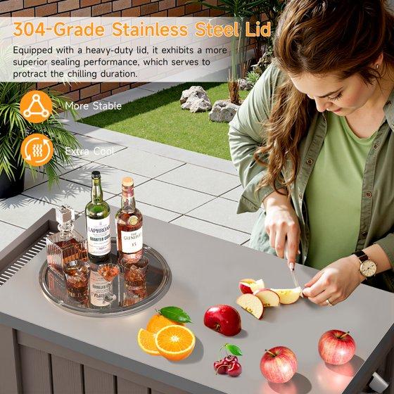 - Premium Material: This portable cooler with wheels made of plastic frame, stainless steel lid and TPU ice bag. The plastic frame made by injection molding process makes the outdoor patio cooler not easy to deform, ensure the outdoor cooler is long lasting in outdoor. The 304 stainless steel lid ensures the sealing of the outdoor beverage cooler cart, while also serving as a cutting board for the preparation of food, vegetables and fruits, provide extraordinary convenience and ease to clean. Food grade TPU ice bag ensures the safety of food, and there is no need to worry about food or drinks being contaminated in the bar cooler.