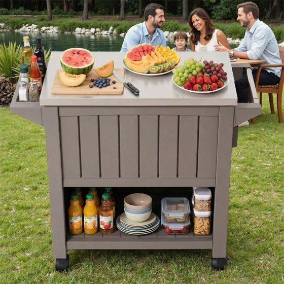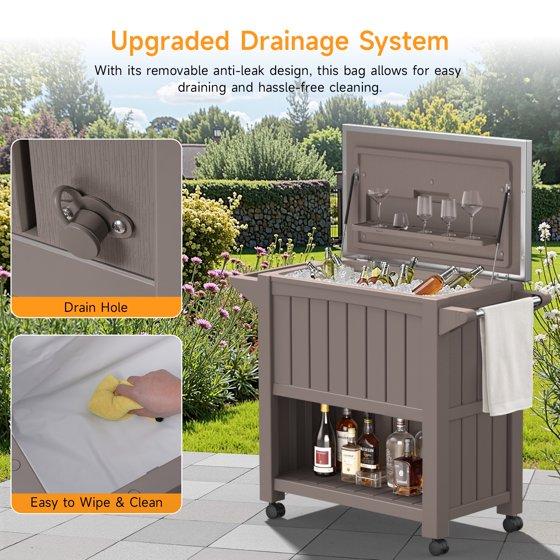 - Mobile Design: Our patio ice chest has 4 rolling wheels that allow you to effortlessly move the cooler from place to another place, also there are 2 casters are lockable, allow you to hold the beverage cart in place without sliding if needed. Our beach cooler cart is portable and safe.