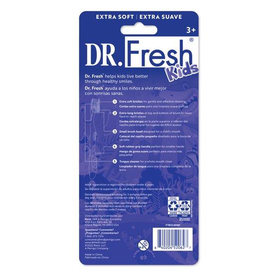 Dr. Fresh Brand Kids Toothbrushes are an economical and high-quality solution for the entire family's oral hygiene needs. A great choice for everyday use, these toothbrushes are designed with a small brush head with extra soft bristles. The kid toothbrushes feature cleaning zones with extra long bristles at the top and bottom of the brush to clean hard to reach places inside the mouth. These Dr. Fresh toothbrushes for kids have a tongue cleaner to help remove odor-causing bacteria. Each toothbrush features a soft rubber grip handle perfect for smaller hands. Includes 5 soft bristles children's toothbrushes. Dentists recommend replacing your toothbrush at least every three months to ensure maximum brushing efficacy. For more effective plaque removal, change your toothbrush as soon as the bristles start to flatten. Dr. Fresh helps kids live better through healthy smiles every day. Put your best smile forward with Dr. Fresh.