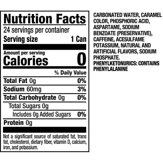CARBONATED WATER, CARAMEL COLOR, ASPARTAME, PHOSPHORIC ACID, NATURAL AND ARTIFICIAL FLAVORS, SODIUM BENZOATE PRESERVATIVE, CAFFEINE