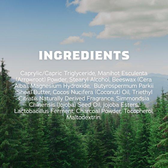 Caprylic/Capric Triglyceride, Manihot Esculenta (Arrowroot) Powder, Stearyl Alcohol, Magnesium Hydroxide, Beeswax, Butyrospermum Parkii (Shea) Butter, Cocos Nucifera (Coconut) Oil, Triethyl Citrate, Simmondsia Chinensis (Jojoba) Seed Oil, Naturally Derived Fragrance, Jojoba Esters, Helianthus Annuus (Sunflower) Seed Oil, Lactobacillus Ferment, Charcoal Powder, Tocopherol, Maltodextrin.
