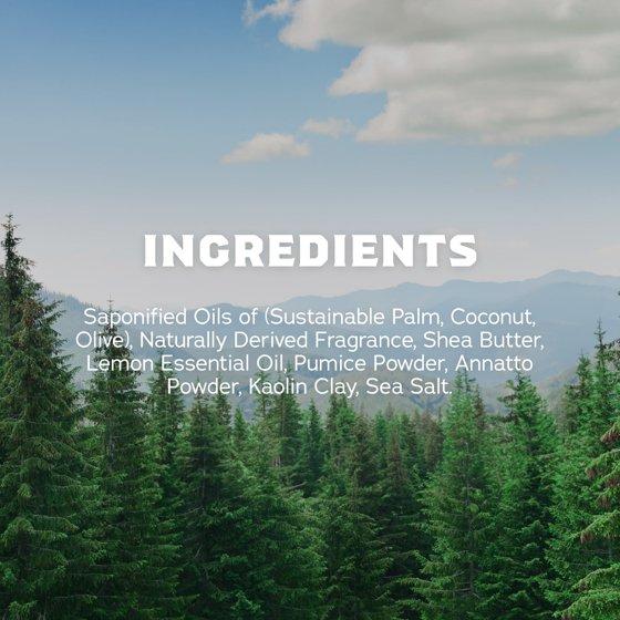Saponified Oils of (Sustainable Palm, Coconut, Olive), Naturally Derived Fragrance, Shea Butter, Lemon Essential Oil, Pumice Powder, Annatto Powder, Kaolin Clay, Sea Salt.