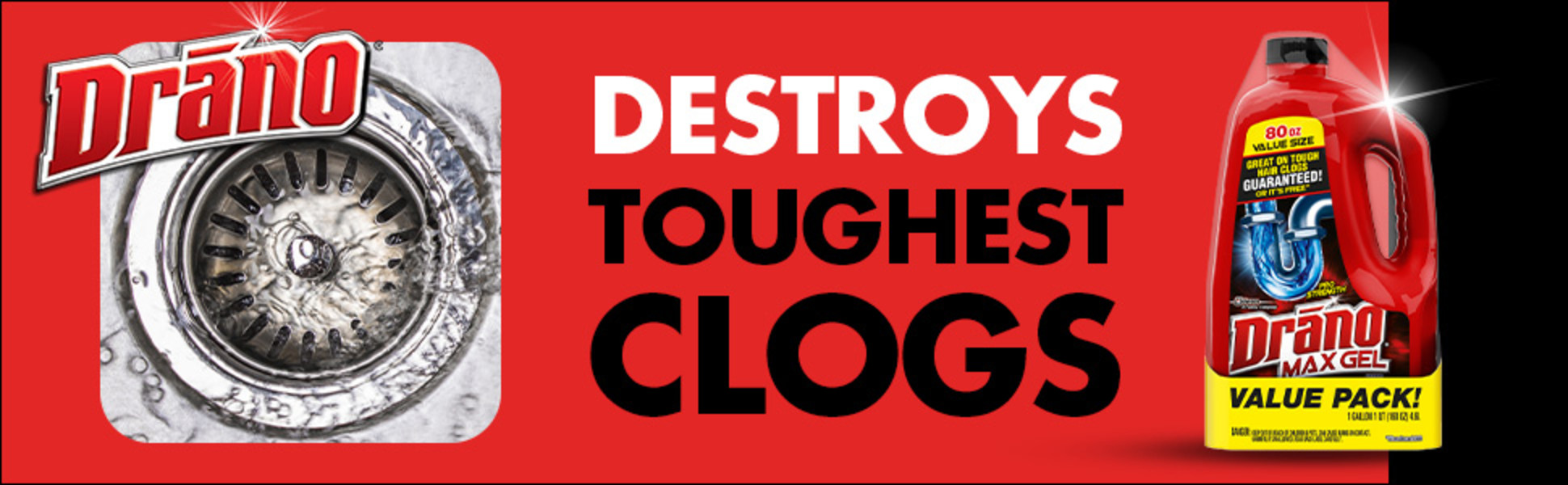 The thick formula of Drano Max Gel Clog Remover cuts right through standing water to blast your toughest clogs fast, making it the #1 Selling Gel Drain Cleaner*. It works great to remove hair, soap scum, greasy clogs and removes sludge blockages to help prevent standing water in drains.