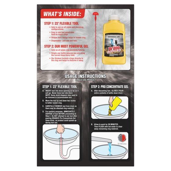 - Contains one 23-inch flexible Drano snake tool & one 16 oz bottle of clog removing gel