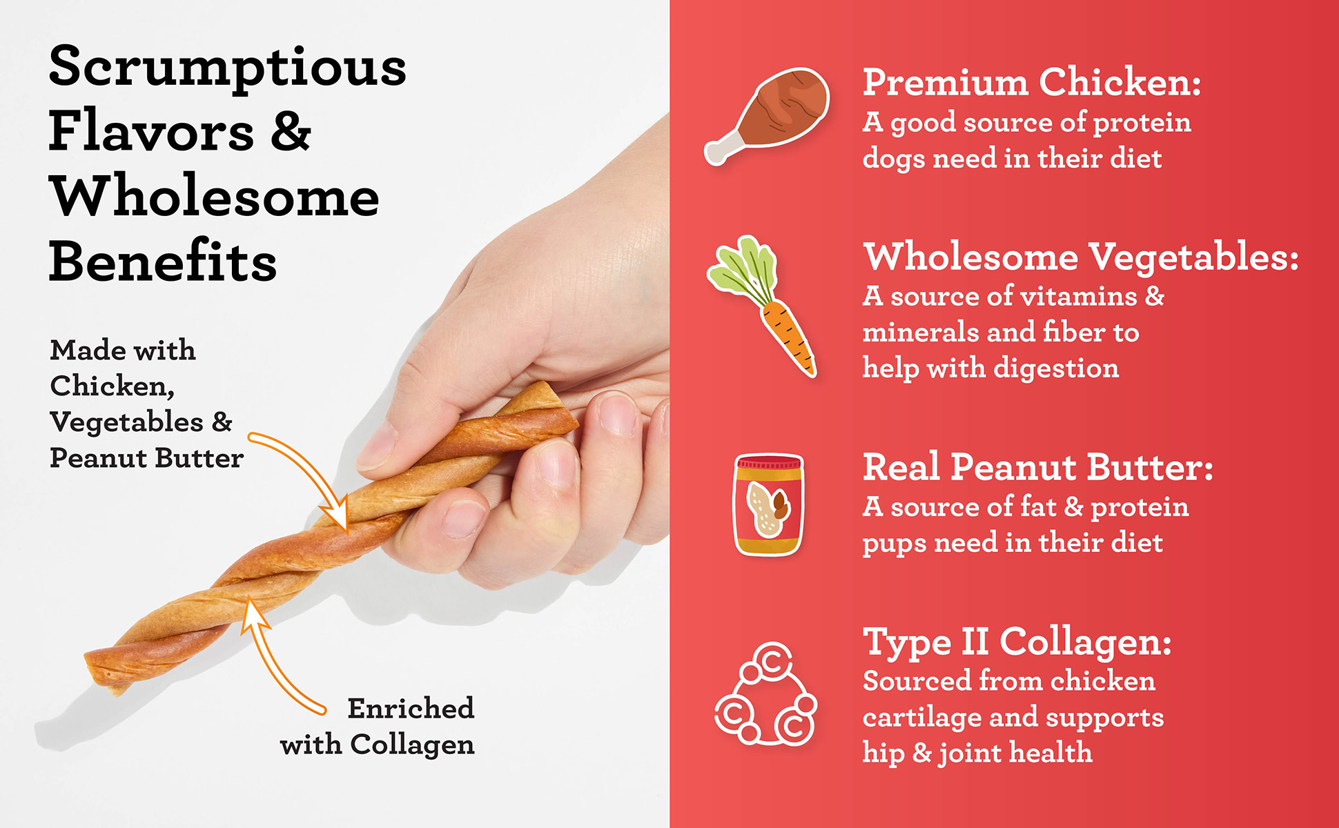 - 100% DELICIOUS, RAWHIDE-FREE DOG CHEWS: Made with premium chicken, wholesome vegetables and real peanut butter for a deliciously entertaining flavor combination.