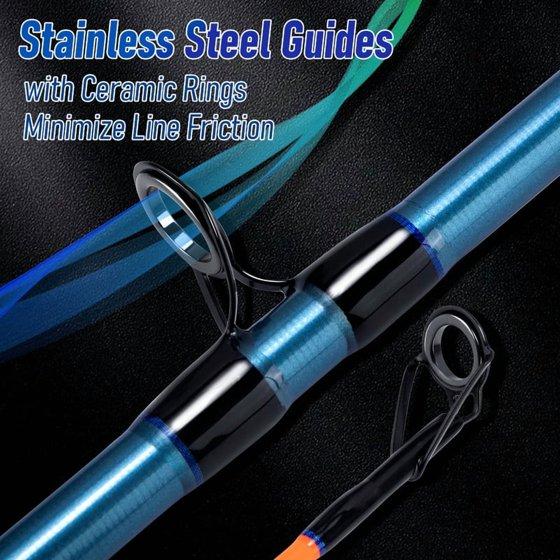 - Stainless steel guides with aluminum oxide inserts reduce line friction for long casts and minimal wear. The aluminum oxide inserts with silicon carbide is used to better dissipate line heat, prevent wear and line grooves in the insert.