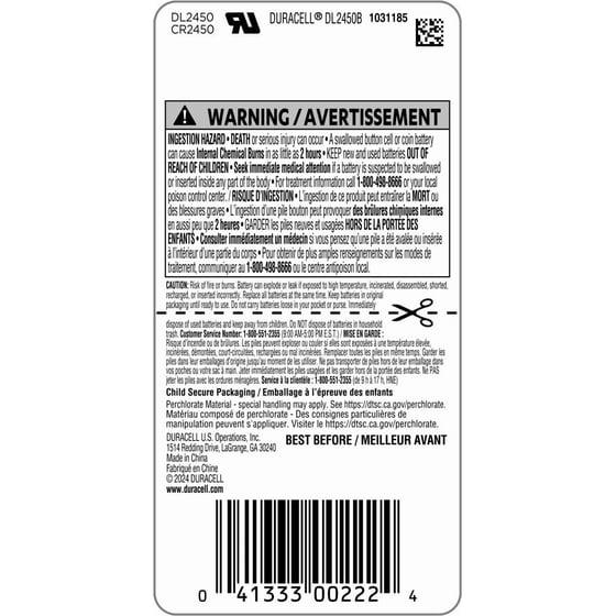 Duracell Lithium Coin CR 2450 3 Volt batteries provide reliable, long-lasting power for your specialty devices. These batteries are guaranteed for 10 years in storage, so you can rest assured they will be ready when you need them. To help ensure the safety of your children, they come in a child-secure package, which is nearly impossible to open without scissors. From storm prep to holiday needs, Duracell is the # 1 trusted battery brand.