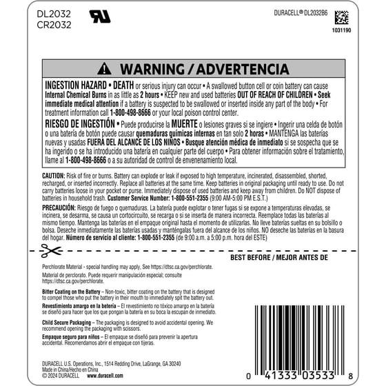 - BITTER TASTE ON BOTH SIDES: Duracell Lithium Coin CR2032 3 Volt batteries have a non-toxic, bitter coating applied on both sides, to help discourage swallowing.