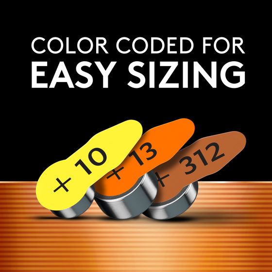 - AVAILABLE SIZES: Duracell Hearing Aid batteries are available in 10—Yellow 312—Brown 13—Orange 675—Blue sizes
