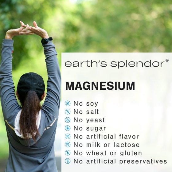Earth's Splendor Magnesium helps support healthy bones, muscles, and teeth. Magnesium is essential to many processes in the body including maintaining healthy blood sugar levels and healthy blood pressure. Our Magnesium formula is free from artificial flavor or preservatives and contains no wheat, milk or milk derivatives, lactose, sugar, salt, or soy. These Earth's Splendor Magnesium Vitamins and Supplements help to support overall health and wellness.