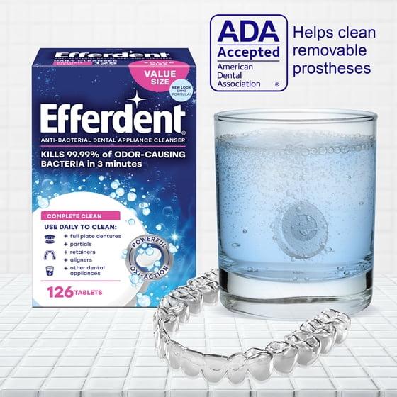 - Efferdent Complete Clean appliance and denture cleaner tablets kill 99.99% of odor-causing bacteria in just 3 minutes