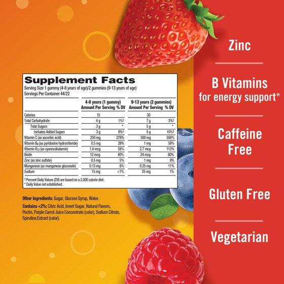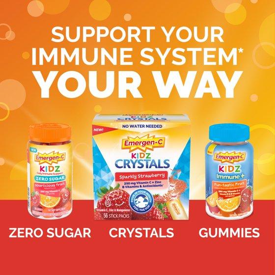 Emergen-C Kidz Daily Immune Support Dietary Supplement for kids are an easy and delicious way to support your child's immune system and energy (1). Emergen-C Kidz gummies offer everything you love about original Emergen-C gummies, but formulated especially for children. These gummies contain a variety of essential nutrients, including 250 mg of high potency vitamin C per gummy for immune system support and B vitamins to enhance energy naturally (1). These gummies come in fun, kid-approved berry flavors, plus they're gluten free, caffeine free and vegetarian. Give your child these dietary supplement gummies under adult supervision as directed. Emergen-C Kidz supplements come in a bottle of 44 gummies. Transform every day with vitamin C from Emergen-C.