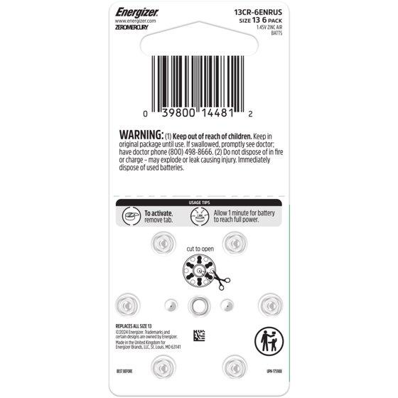 Energizer Hearing Aid Batteries Size 13, Orange Tab, 6 Pack