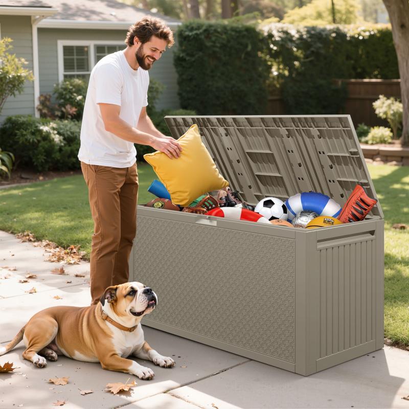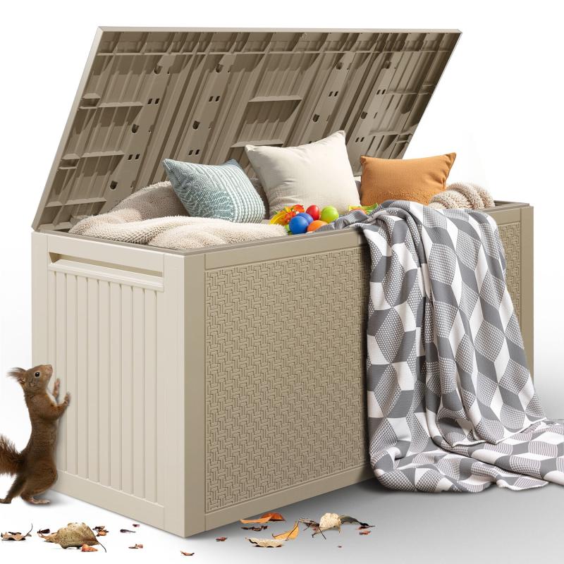 🏠【Versatile Storage】- This deck box can be used indoors and outdoors. Indoors, you can store quilts, large items, sports equipment, which also can be used in the garage, workshop, and other places; outdoors, you can store grill supplies, patio cushions, gardening tools, and tools for outdoor use.
