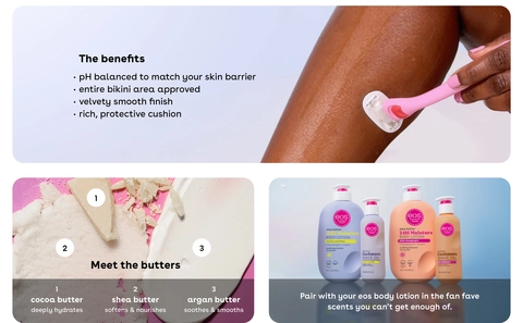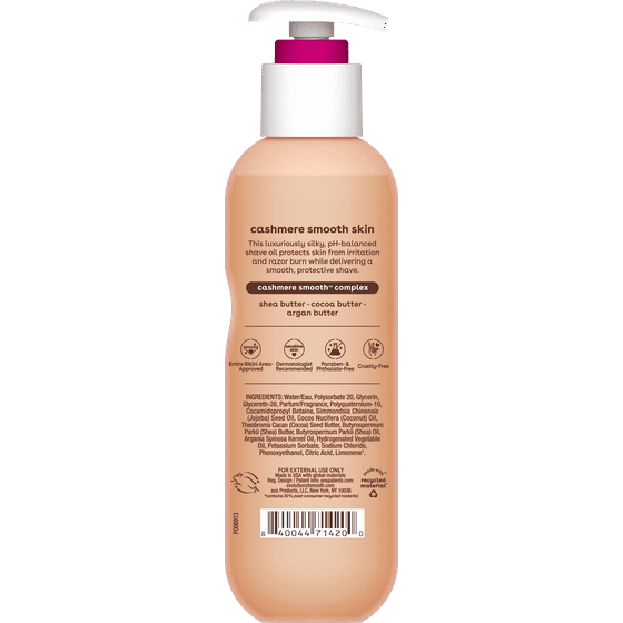 - CASHMERE SMOOTH™ COMPLEX: eos Shave Oil is made with a moisture-rich blend of shea butter, cocoa butter, and argan butter to soften, hydrate, and cushion skin as you shave