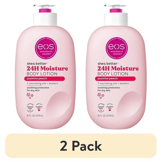 - SHEA BETTER BODY LOTION: Our sparkling and luscious Jasmine Peach scent contains fragrance notes of apricot nectar, sparkling jasmine, and vanilla sugar. eos 24-hour hydration body lotion is made with natural ingredients to leave your skin smooth from head-to-toe.
