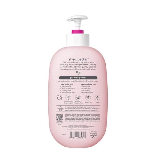 - SHEA BETTER BODY LOTION: Our sparkling and luscious Jasmine Peach scent contains fragrance notes of apricot nectar, sparkling jasmine, and vanilla sugar. eos 24-hour hydration body lotion is made with natural ingredients to leave your skin smooth from head-to-toe.