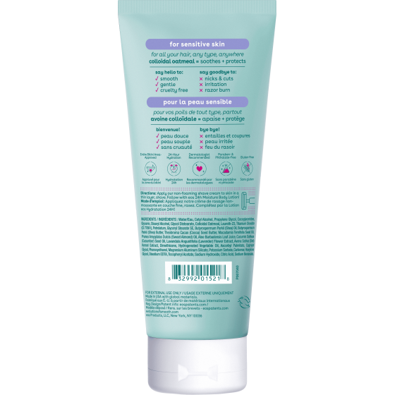 Water/Eau, Cetyl Alcohol, Propylene Glycol, Cocoglycerides, Glycerin, Stearyl Alcohol, Glycol Distearate, Colloidal Oatmeal, Laureth-23, Titanium Dioxide (CI 77891), Petrolatum, Glyceryl Stearate SE, Butyrospermum Parkii (Shea) Oil, Butyrospermum Parkii (Shea) Butter, Theobroma Cacao (Cocoa) Seed Butter, Macadamia Ternifolia Seed Oil, Prunus Amygdalus Dulcis (Sweet Almond) Oil, Aloe Barbadensis Leaf Juice, Cucumis Sativus (Cucumber) Seed Oil, Lavandula Angustifolia (Lavender) Flower Extract, Avena Sativa (Oat) Kernel Extract, Dimethicone, Hydrogenated Vegetable Oil, Ascorbyl Palmitate, Caprylyl Glycol, Phenoxyethanol, Magnesium Aluminum Silicate, Potassium Sorbate, Carbomer, Hexylene Glycol, Disodium EDTA, Tocopheryl Acetate, Sodium Hydroxide, Citric Acid, Sodium Benzoate.