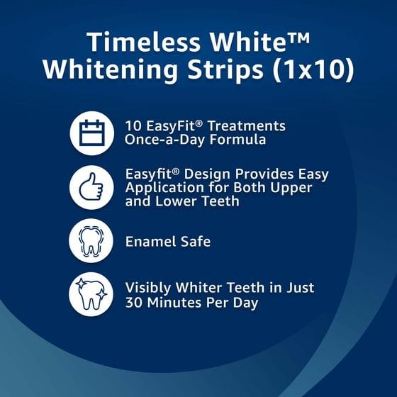 Get visibly whiter teeth with Equate Timeless White Whitening Strips. Compare to Crest 3D Whitestrips, Classic White. These whitening strips feature the convenient EasyFit design which provides a comfortable fit, excellent adhesion, and easy application for both upper and lower teeth. In just 30 minutes per day, you can enjoy noticeably whiter teeth. Watch as stubborn coffee, wine, and smoking stains begin to disappear. These teeth whitening strips contain the same enamel-safe ingredient used by dentists. For optimal results, use product 30 minutes daily for 10 consecutive days. Perfect for a wedding, prom or every day activities. Get a brighter, whiter smile with Timeless White Whitening Strips. Welcome to a whiter smile.