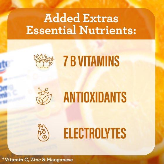 Vitamin C, Thiamine, Riboflavin, Niacin, Vitamin B6, Folate, Vitamin B12, Pantothenic Acid, Calcium, Phosphorus, Magnesium, Zinc, Manganese, Chromium, Sodium, Potassium, Fructose, Citric Acid. Contains <2%: Maltodextrin, Malic Acid, Dried Orange Juice Concentrate, Acacia, Sugar, Natural Flavors, Corn Syrup Solids, Silicon Dioxide, Modified Food Starch, Beta-Carotene (color), Glycine, Aspartic Acid, Tartaric Acid, Water, Tocopherol.