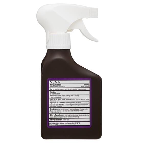Equate Hydrogen Peroxide Topical Solution provides your first choice in antiseptics in a more convenient option for application. Made from three-percent hydrogen peroxide, this antiseptic works to prevent infection and kill germs at the site of minor cuts, scrapes and burns. Its handy seven-inch tall spray-bottle design makes it easy to hold onto and get just the right amount out with every use. To use, simply clean the affected area and spray a small amount to the wound one to three times daily, then bandage if needed. This easy-to-use eight-ounce bottle comes with a screw-on spray nozzle with a squeeze trigger for convenient wound treatment, and it's easily stored in medicine cabinets and bathroom cupboards. You can shop confidently for first aid necessities knowing that Equate Hydrogen Peroxide Topical Solution comes with a satisfaction guarantee.