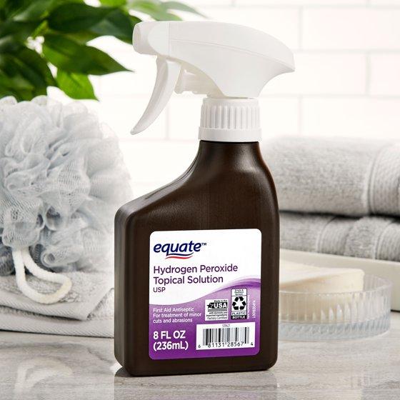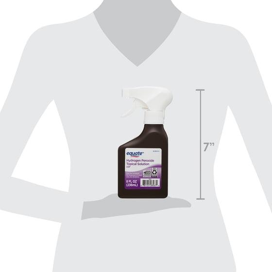 Equate Hydrogen Peroxide Topical Solution provides your first choice in antiseptics in a more convenient option for application. Made from three-percent hydrogen peroxide, this antiseptic works to prevent infection and kill germs at the site of minor cuts, scrapes and burns. Its handy seven-inch tall spray-bottle design makes it easy to hold onto and get just the right amount out with every use. To use, simply clean the affected area and spray a small amount to the wound one to three times daily, then bandage if needed. This easy-to-use eight-ounce bottle comes with a screw-on spray nozzle with a squeeze trigger for convenient wound treatment, and it's easily stored in medicine cabinets and bathroom cupboards. You can shop confidently for first aid necessities knowing that Equate Hydrogen Peroxide Topical Solution comes with a satisfaction guarantee.
