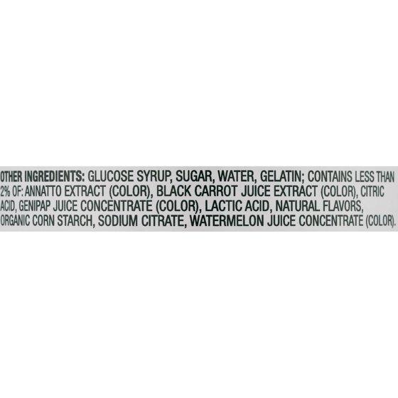 Other Ingredients: Glucose syrup, Sugar, Water, Gelatin; Contains less than 2% of: Annatto extract (color), Black carrot juice extract (color), Citric acid, Genipap juice concentrate (color), Lactic acid, Natural flavors, Organic corn starch, Sodium citrate, Watermelon juice concentrate (color).