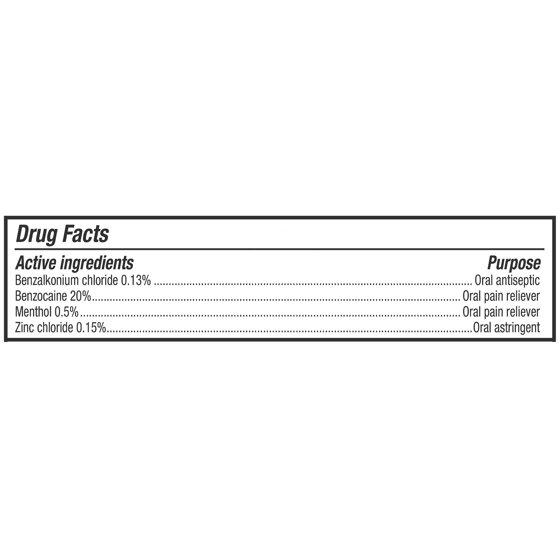 benzalkonium chloride, benzocaine, menthol, zinc chloride, ammounium glycyrrhizate, blue 1, flavor, PEG-8, PEG-75, sodium saccharin, sorbic acid