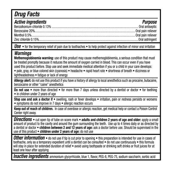 - With 20% Benzocaine to relieve oral pain