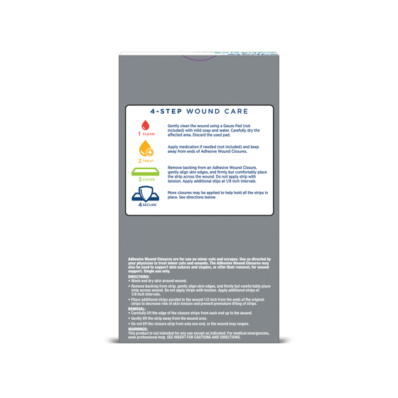 Equate Adhesive Wound Closures Surgical Tape Strips, 30 Count are designed to close minor cuts and wounds effectively and securely. These sterile strips are the same type used in hospitals to support healing with minimal scarring and improved cosmetic results. Ideal for use in a 4-step wound care process—clean, treat, cover, and secure—they offer a strong hold without the need for stitches. Equate Adhesive Wound Closures Surgical Tape Strips, 30 Count are a reliable choice for managing minor skin injuries at home.