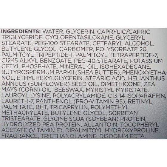 water, glycerin, caprylic/capric triglyceride, cyclopentasiloxane, glyceryl stearate, peg-100 stearar=te, cetearyl, alcohol, butylene glycol, carbomer, polysorbate 20, palmitoyl tripeptide-1, palmotoyl tetrapeptide-7, c12-15 alkyl benzoate, peg-40 stearate, potassiom cetyl phosphate, mineral oil, isohexadecabe, butyrospermum parkii (shea butter), phenoxyethanol, ethlhexylglycerin, stearic acid, helianthus annuus (sunflower) seed oil, dimethicone, zea mays (corn) oil, beeswax, myristyl myristate, laureth-7, panthenol (pro-vitamin b5), retinyl palmitate, bht, tricaprylin, polymethyl methacrylate, butylene glycol, sorbitan tristearate, glycone soja (soybean) protein, hydrolyzed pea protein, allantoin, tocopheryl acetate (vitamin E), dipalmitoyl hydroxyproline, fragrance, triethanolamine, disodium edta
