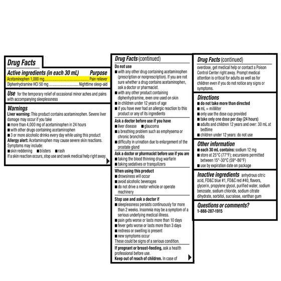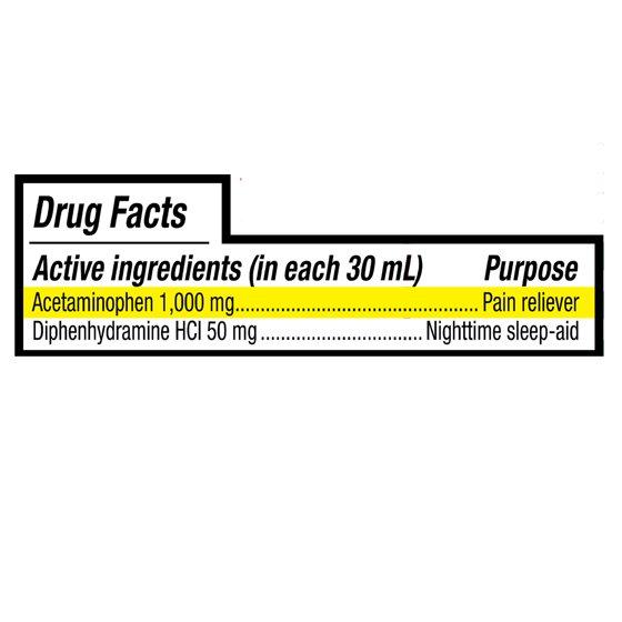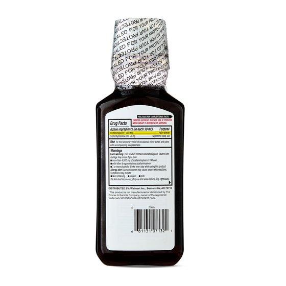 Equate Alcohol-Free Nighttime Pain Reliever+Sleep-Aid Liquid, Acetaminophen 1000mg Diphenhydramine 50 mg, Midnight Berry Flavor, 12 fl oz
