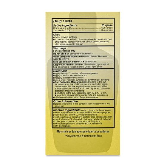 Actives: homosalate 5.0%, zinc oxide 3.0% Inactives: water, glycerin, isohexadecane, sodium acrylate/sodium acryloyldimethyl taurate copolymer, polysorbate 80, laureth-7, cyclopentasiloxane, cyclohexasiloxane, steareth-21, stearyl alcohol, caprylyl glycol, behenyl alcohol, phenoxyethanol, cetyl alcohol, fragrance, hydroxyacetophenone, disodium EDTA, steareth-2, oleth-3 phosphate