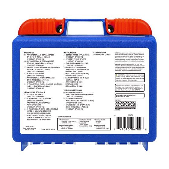 Equate All-Purpose First Aid Kit 140 Pieces provides a comprehensive assortment of first aid supplies for your everyday life. Designed to help treat cuts and scrapes, 1st and 2nd-degree burns, bruises, minor aches, and pains. It includes various antibacterial bandages, instant ice pack, antiseptic wipes, gauze pads, burn ointments, and much more. Everything comes packed in a durable plastic case with slide latches and organized case for easy use. It also includes a component map guide. This kit is compact and convenient to carry for your next family adventure.