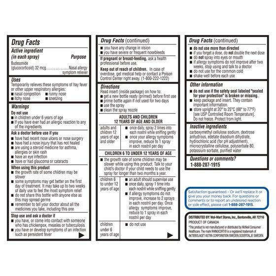 Active Ingredients: Budesonide (Glucocorticoid) (32 mcg). Purpose: Nasal allergy symptom reliever. Inactive Ingredients: Carboxymethyl Cellulose Sodium, Dextrose Anhydrous, Edetate Disodium Dihydrate, Hydrochloric Acid (for pH Adjustment), Microcrystalline Cellulose, Polysorbate 80, Potassium Sorbate, Purified Water.