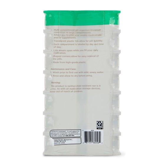 Keep your important medications organized with this convenient Equate AM/PM Weekly Pill Planner. With easy-to-open lids, this pill case has 14 compartments with a large capacity. The lids of each compartment are imprinted with AM and PM for one full week of organized medication. Keep it on your bathroom counter or your nightstand for easy access. As with all medication storage devices, keep out of reach of children. The Equate AM/PM Weekly Pill Planner helps you stay on top of your important medications.