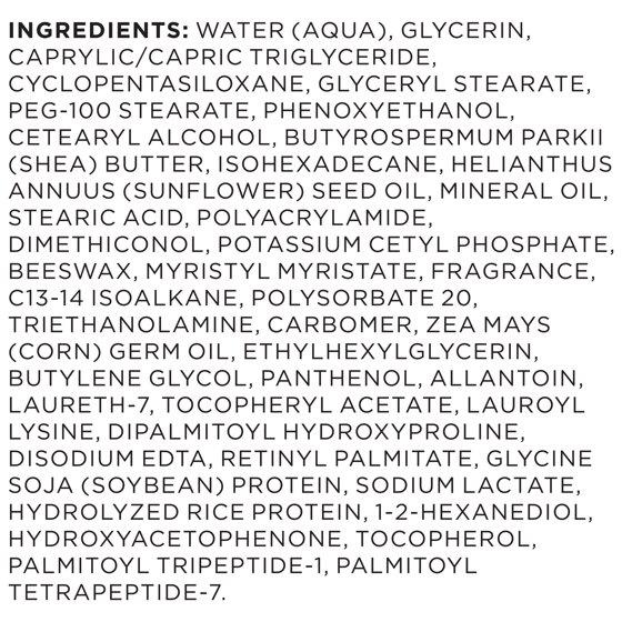 Aqua (Water),Glycerin,Caprylic/Capric Triglyceride,Cyclopentasiloxane,Glyceryl Stearate,PEG-100 Stearate,Phenoxyethanol,Cetearyl Alcohol,Butyrospermum Parkii (Shea) Butter,Helianthus Annuus Seed Oil,Isohexadecane,Paraffinum Liquidum,Polyacrylamide,Stearic Acid,Beeswax,Dimethiconol,Myristyl Myristate,Fragrance,Potassium Cetyl Phosphate,C13-14 Isoalkane,Polysorbate 20,Triethanolamine,Carbomer,Zea Mays Germ Oil,Ethylhexylglycerin,Butylene Glycol,Allantoin,Panthenol,Laureth-7,Dipalmitoyl Hydroxyproline,Disodium EDTA,Lauroyl Lysine,Tocopheryl Acetate,Retinyl Palmitate,Glycine Soja Protein ,Sodium Lactate,Hydrolyzed Rice Protein ,1,2-Hexanediol,Hydroxyacetophenone,Tocopherol,Palmitoyl Tripeptide-1,Palmitoyl Tetrapeptide-7
