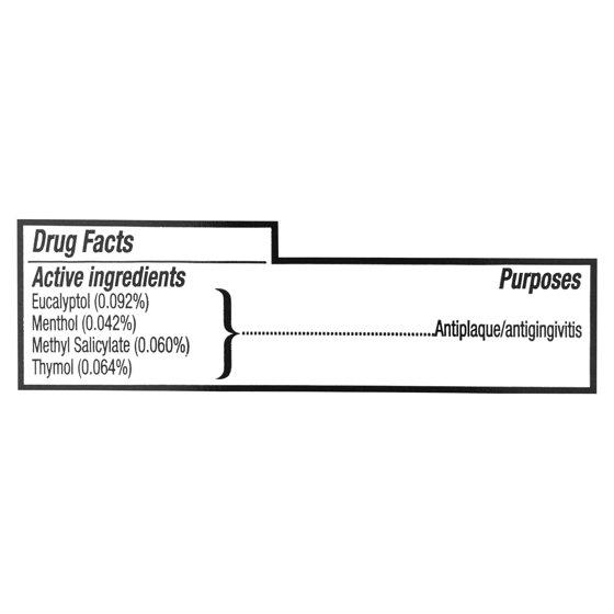 Active Ingredients: Eucalyptol (0.092%) Menthol (0.042%) Methyl Salicylate (0.060%) Thymol (0.064%). Inactive Ingredients: water, alcohol (21.6% v/v), sorbitol, poloxamer 407, flavor, sodium benzoate, benzoic acid, sodium saccharin, green #3.