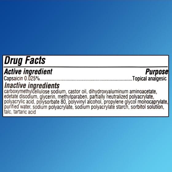 - Active ingredient: Capsaicin 0.025% (topical analgesic)