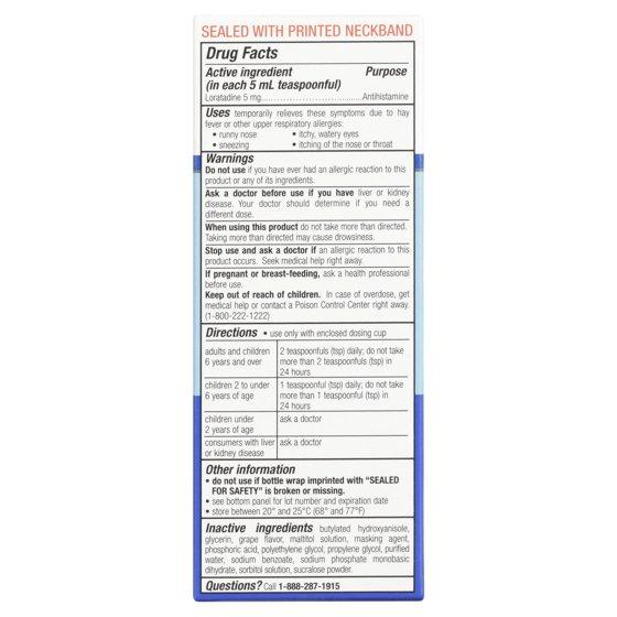 - 4 fl oz bottle of loratadine dye-free grape suspension