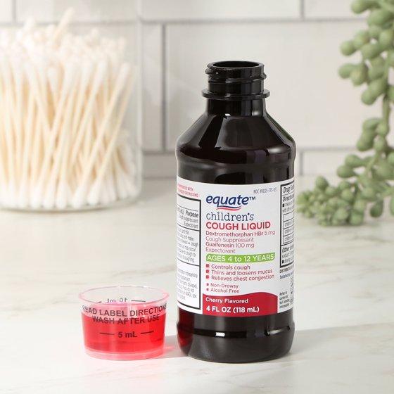 Equate Children's Cough Liquid, Cherry Flavor, Ages 4 to 12 Years, 4 fl oz, Compare to Children's Mucinex® Cough Active Ingredients