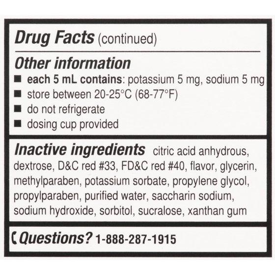 Citric Acid Anhydrous, Dextrose, d&c Red #33, FD&C Red #40, Flavor, Glycerin, Methylparaben, Potassium Sorbate, Propylene Glycol, Propylparaben, Purified Water, Saccharin Sodium, Sodium Hydroxide, Sorbitol, Sucralose, Xanthan Gum.