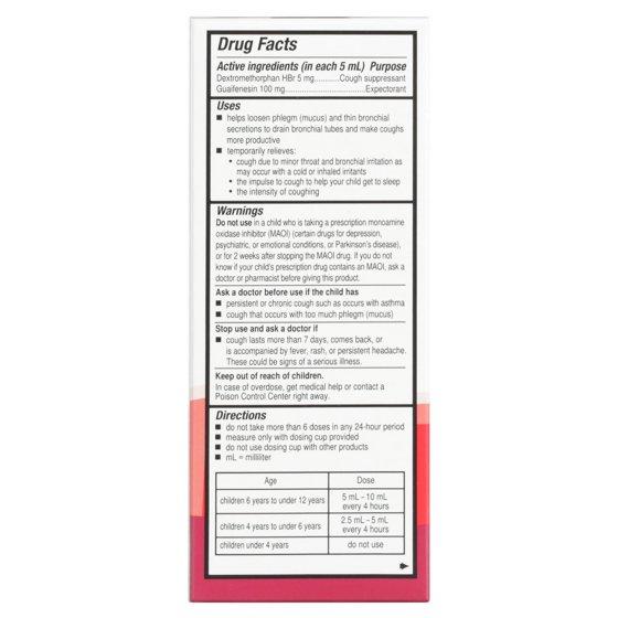 Active Ingredients (in each 5 ml) Dextromenthorphan HBr 5mg - cough suppressant. Guaifenesin 100mg - Expectorant