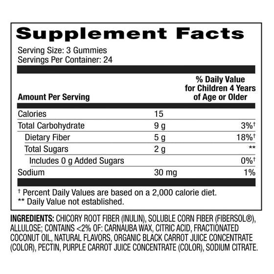 Chicory root fiber (Inulin), Soluble corn fiber (Fibersol), Allulose; Contains <2% of: Carnauba wax, Citric acid, Fractionated coconut oil, Natural flavors, Organic black carrot juice concentrate (color), Pectin, Purple carrot juice concentrate (color), Sodium citrate