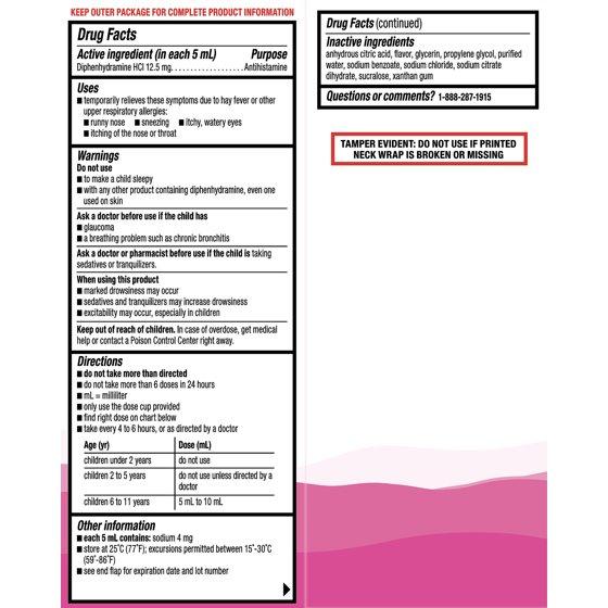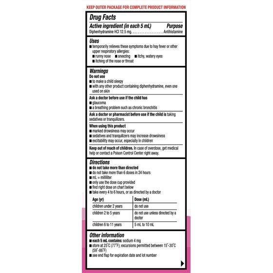 - Active ingredient: diphenhydramine HCl, an antihistamine, which compares to the active ingredient in Children's Benadryl Allergy Liquid