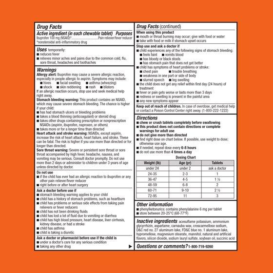 Active ingredient (in each chewable tablet): Ibuprofen 100 mg (NSAID)* *nonsteroidal anti-inflammatory drug. Inactive ingredients: acesulfame potassium, ammonium glycyrrhizin, aspartame, carnauba wax, croscarmellose sodium, D&C red no. 27 aluminum lake, FD&C blue no. 1 aluminum lake, hypromellose, magnesium stearate, mannitol, natural and artificial flavors, silicon dioxide, sodium lauryl sulfate, soybean oil, succinic acid.