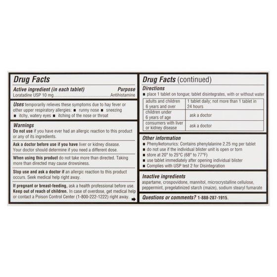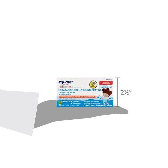 Drug Facts Active ingredient (in each tablet) - Purpose Loratadine USP 10 mg - Antihistamine. Get rid of your child's pesky allergy symptoms with Equate Children's Loratadine Orally Disintegrating Antihistamine Tablets. These easy-to-swallow dissolvable tablets will provide rapid relief for indoor and outdoor allergens, alleviating symptoms such as sneezing, runny nose, itchy and watery eyes, and itchy throat or nose. Don't let allergies keep your little one from having fun -- fight discomfort with Equate Children's Loratadine Orally Disintegrating Antihistamine Tablets.