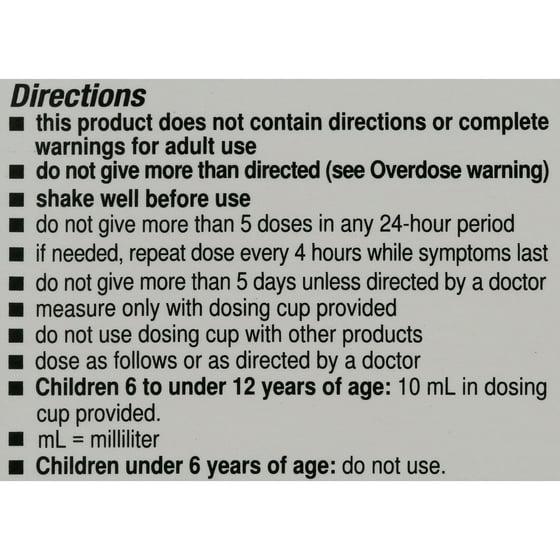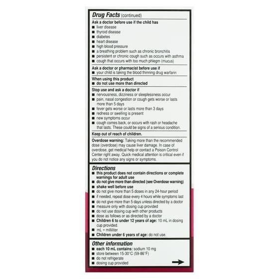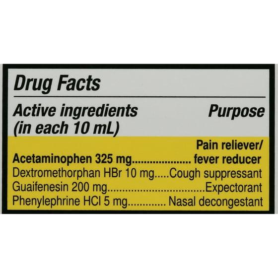 Active Ingredients (in each 10 ml) Acetaminophen 325 mg - pain reliever/fever reducer. Dextromenthorphan HBr 10mg - cough suppressant. Guaifenesin 200mg - Expectorant Phenylephrine HCI 5mg - Nasal decongestant