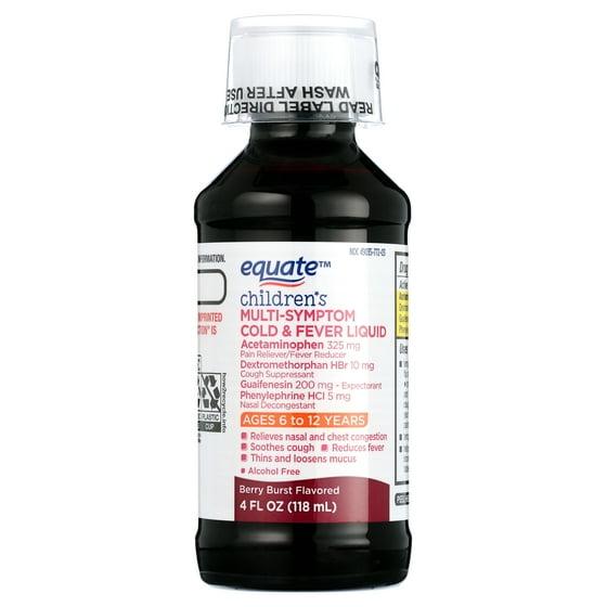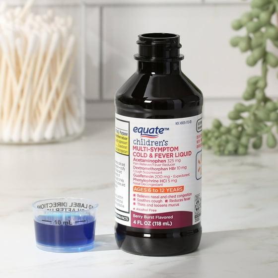 Equate Children's Multi-Symptom Cold & Fever Liquid, Berry Burst Flavor, Ages 6 to 12 Years, 4 fl oz, Compare to Children's Mucinex® Multi-Symptom Cold & Fever Active Ingredients